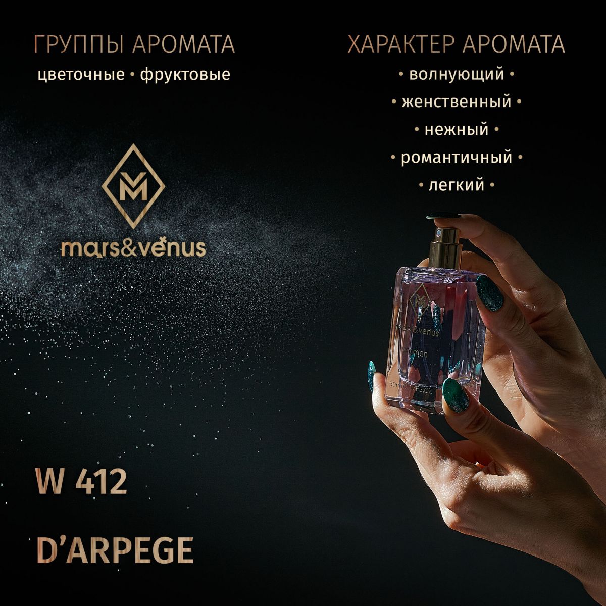 Mars&Venus W412 D'arpege – это беззаботный и теплый аромат, женственный, мягкий и легкий в ношении, который отлично подходит для повседневного использования, его можно носить в офисе или на встрече с друзьями в течение дня. Это идеальный аромат для тех, кто предпочитает свежие и зеленые ароматы, а его сияющие цветочные ноты лучше всего сочетаются с весенней и ранней летней погодой.