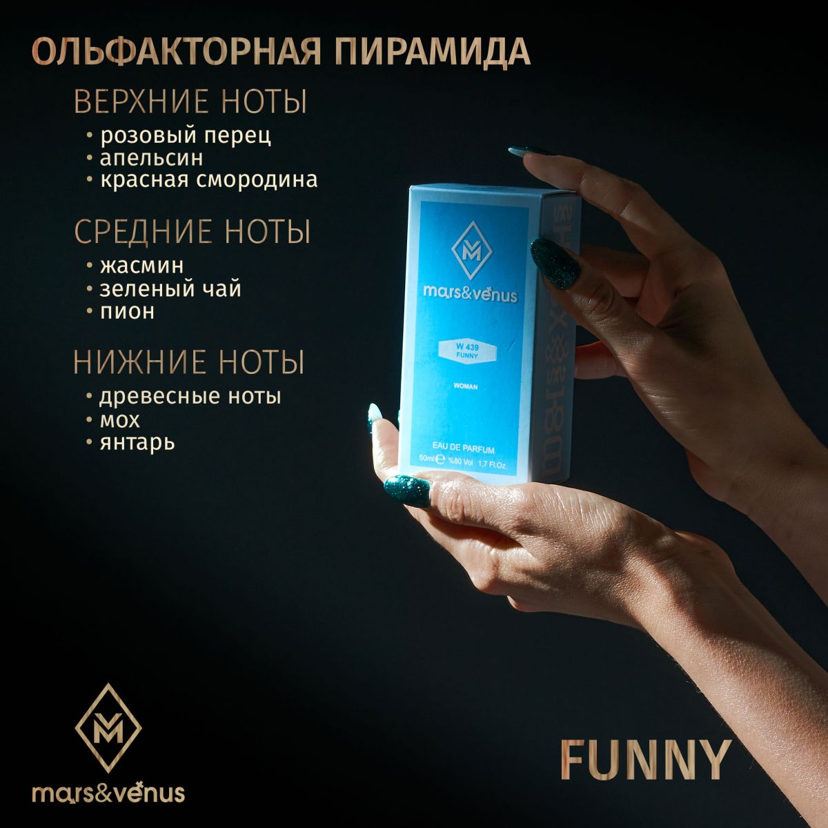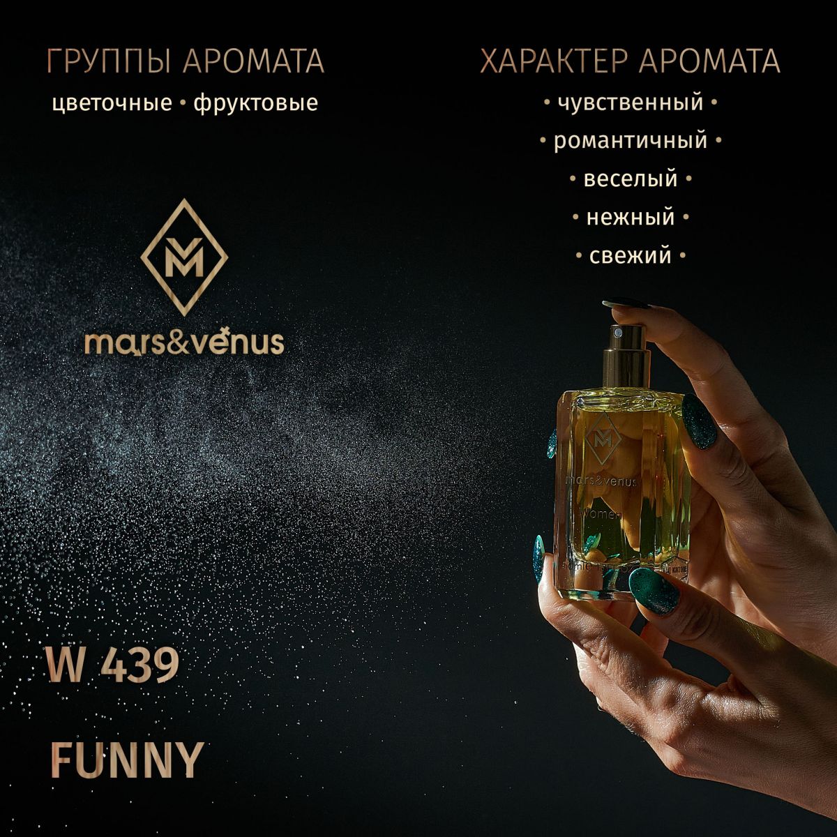 Аромат W 439 Mars&Venus Funny заставит вас чувствовать себя прекрасно и думать о беззаботных днях, он словно специально создан против зимней депрессии и для хорошего настроения.