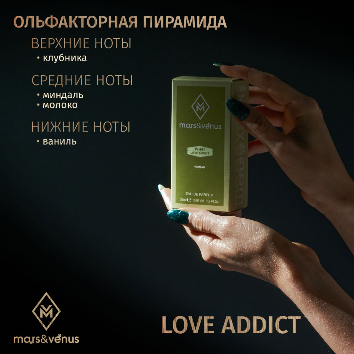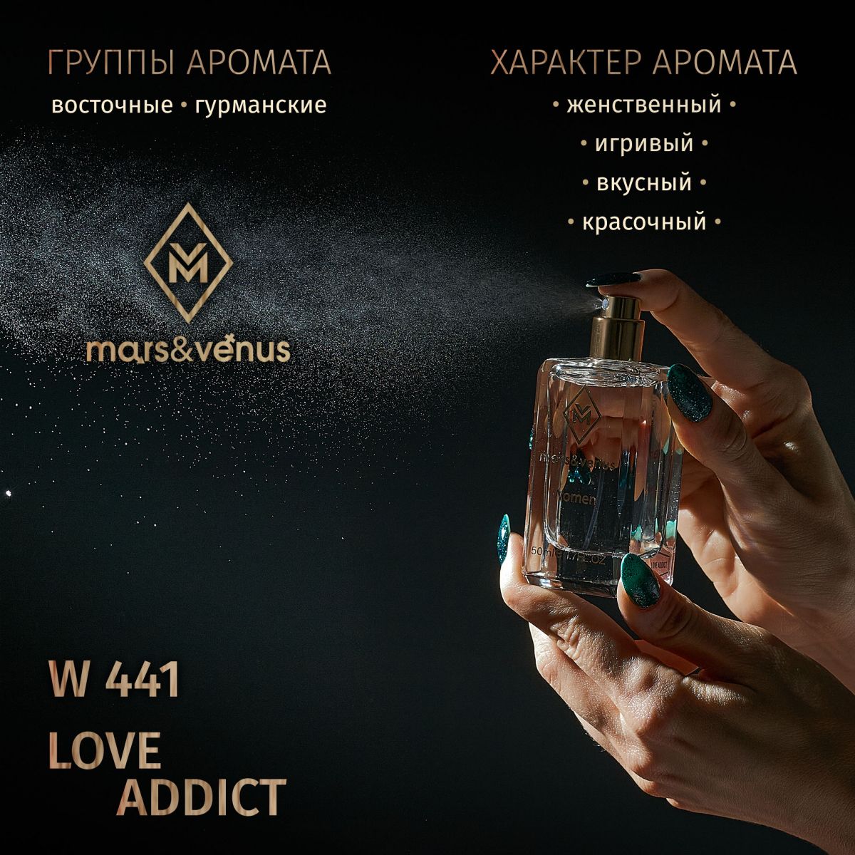 Сладкая и достаточно лёгкая парфюмерная вода W 441 Mars&Venus Love Addict великолепно подойдёт тем молодым девушкам и женщинам, которые отдают предпочтение простым и ненавязчивым ароматам. Эта прекрасная вкусная смесь отлично подходит для весны и лета и может украсить любой повседневный ансамбль, независимо от времени дня и события.