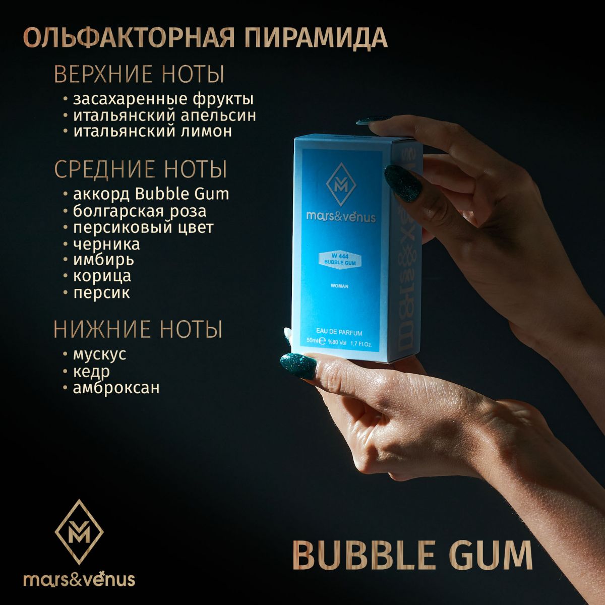 Совершенно яркий и сочно-сладкий аромат Mars&Venus W 444 Bubble Gum, вызывающий радостный восторг, обладает таким очарованием, что вы с удовольствием захотите украсить им свой повседневный весенне-летний образ.